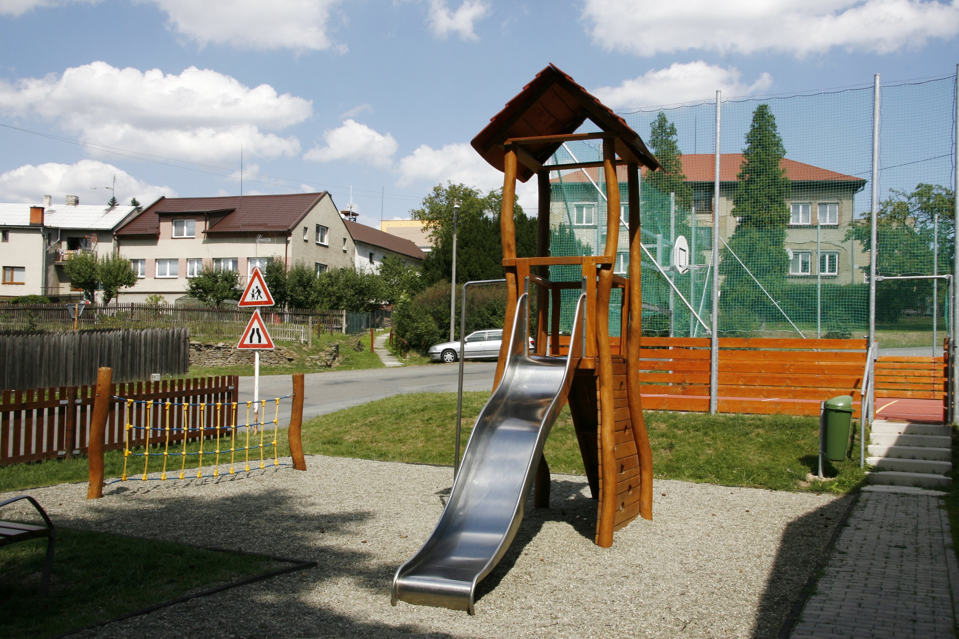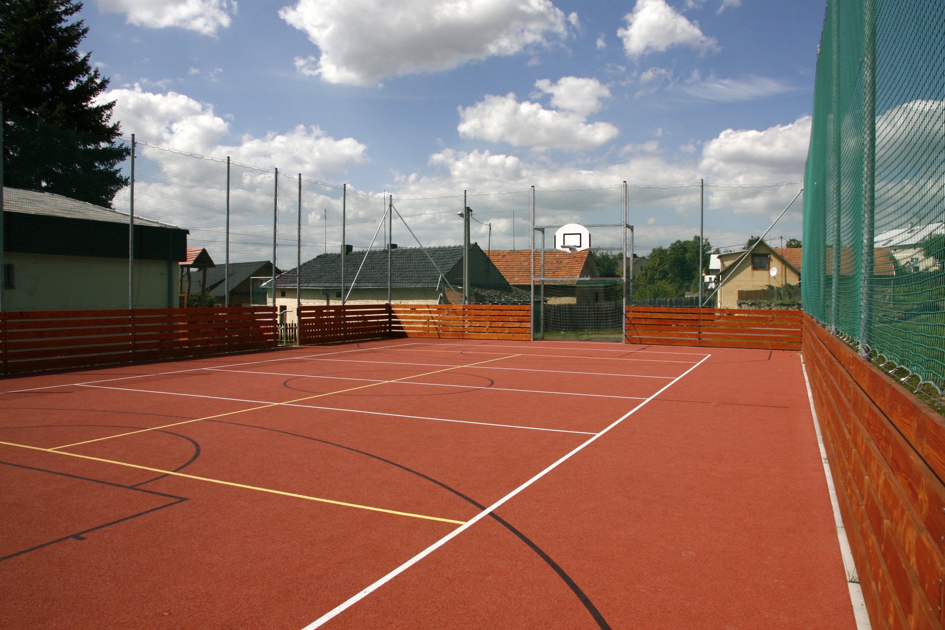 Předmět zakázky: Byla provedena oprava stávajícího hřiště pro míčové hry, výstavba dětského hřiště, kontejnerového stání a centrální plochy pro posezení určené ke krátkodobé relaxaci. Území bylo doplněno o nový městský mobiliář. Součástí rekonstrukce hřiště bylo také provedení nového osvětlení a oplocení.
